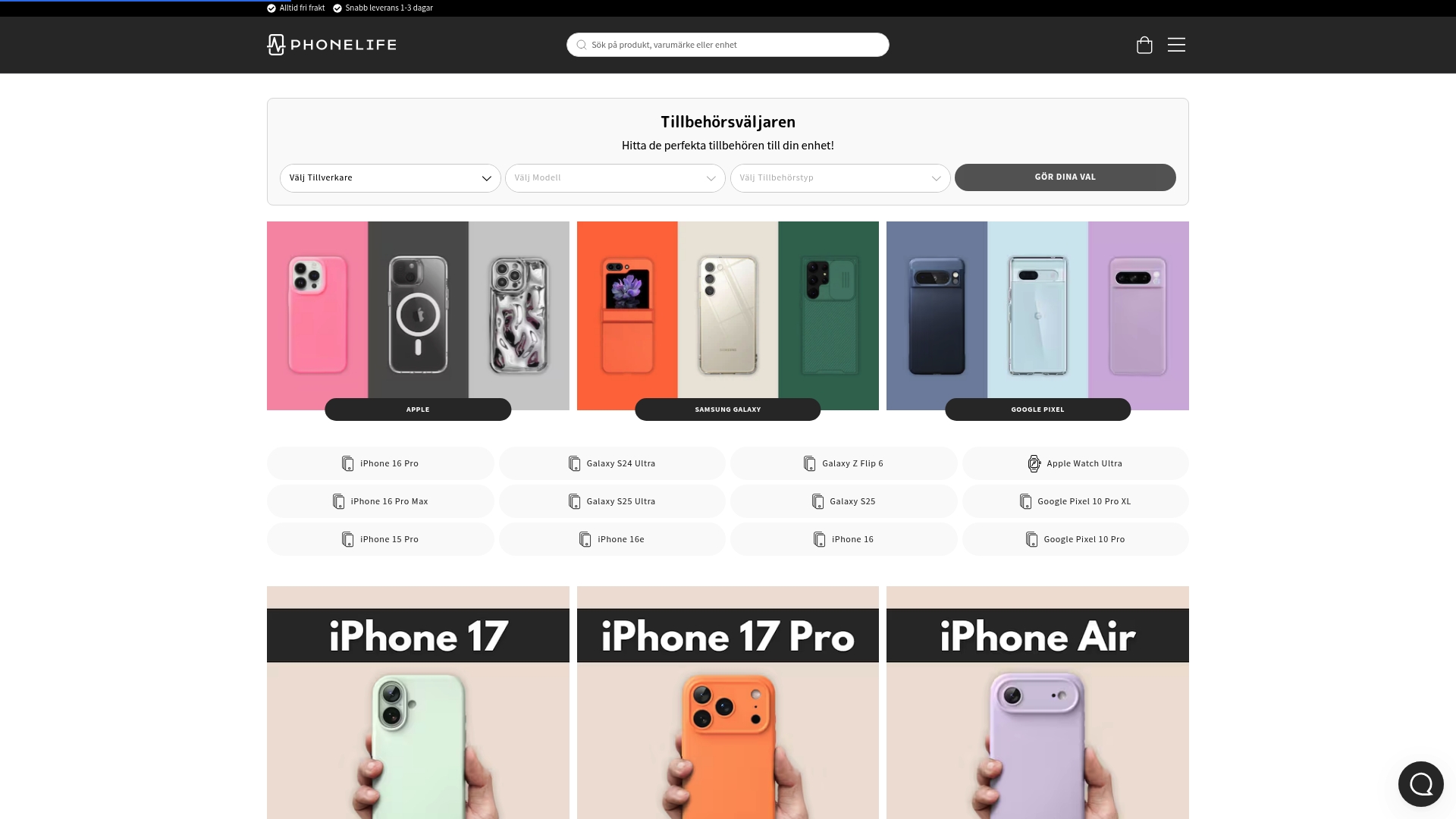 PhoneLife listar och kategoriserar produkter efter modell och typ, vilket gör det enkelt att hitta rätt tillbehör för en specifik telefon eller wearable. Sortimentet täcker mobilskal, skärmskydd, surfplattetillbehör och straps eller laddare för smartklockor. Sajten innehåller också information om cookies och sekretess, samt val för fri frakt och snabb leverans — funktioner som är viktiga när du behöver en reservdel eller ett skydd snabbt.