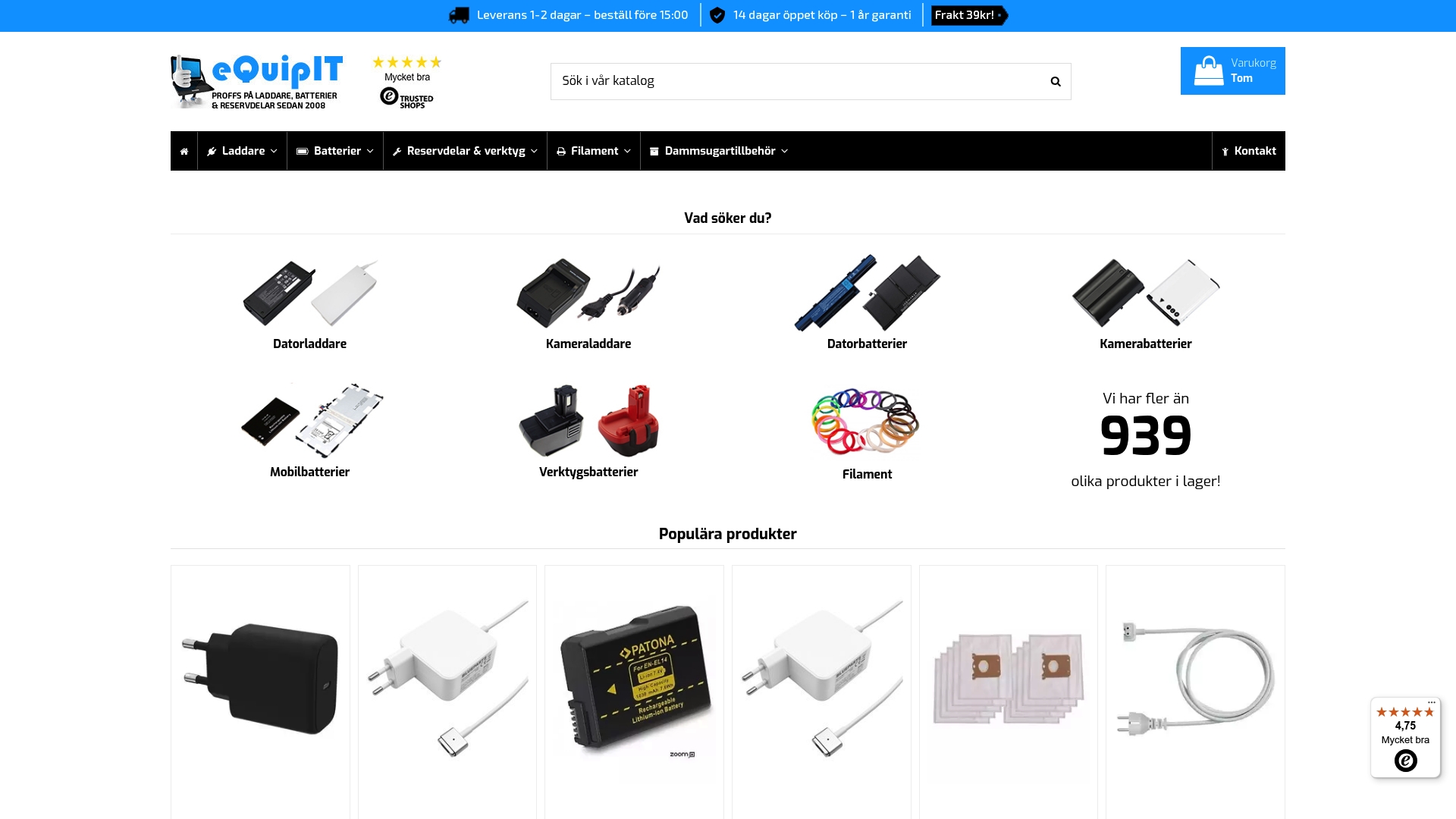 eQuipIT erbjuder över 1200 produkter på lager med fokus på laddare, batterier och reservdelar för laptop, mobil och kamera. Lagervaror skickas samma dag före kl 15, och webbplatsen visar tydlig tillgänglighet för omedelbar leverans.