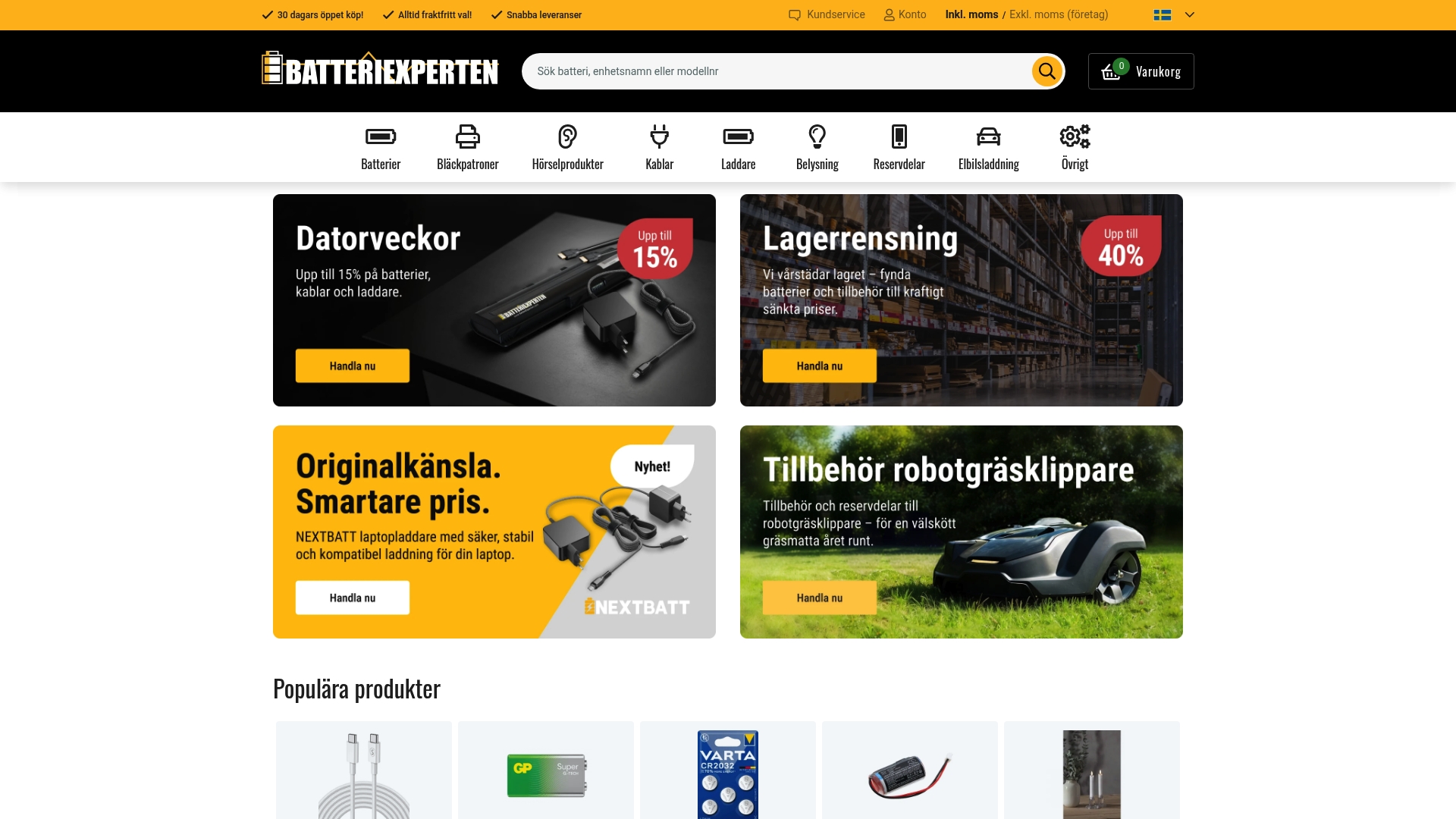 Batteriexperten erbjuder ett stort lager med över 200 000 produkter, snabb orderhantering från eget lager, fri frakt som fraktval och 30 dagars öppet köp. Webbplatsen riktar sig både till konsumenter och företag och lyfter fram personlig support.
