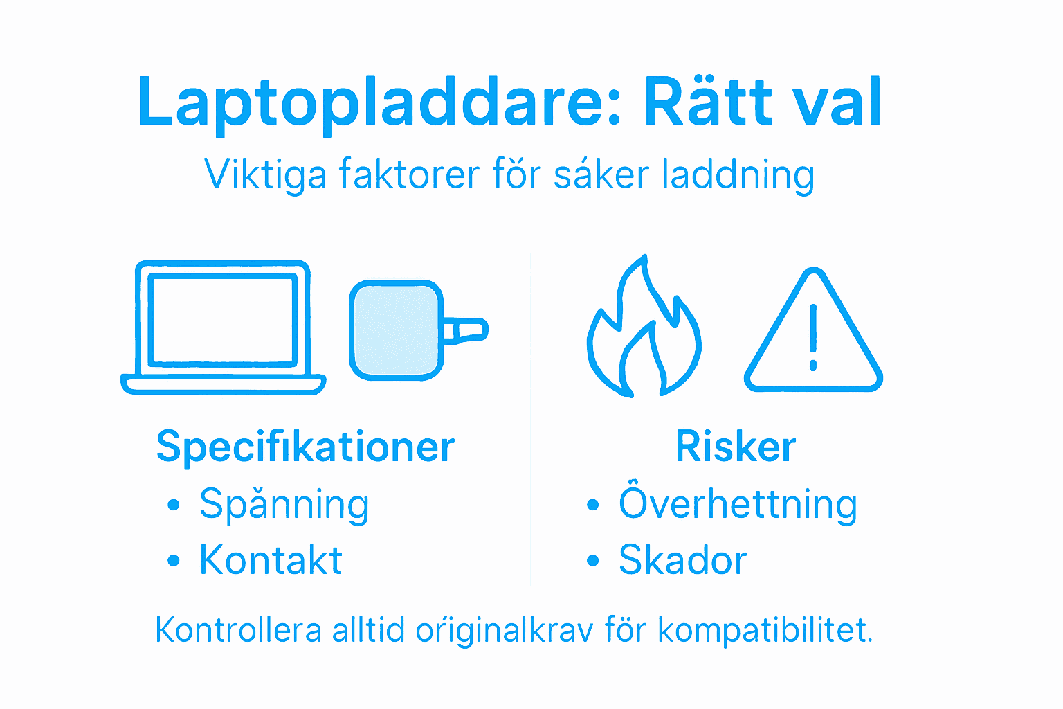 | Säkerhetsrisker | Användning av fel laddare kan leda till överhettning, batteriskador och elektroniska störningar. |