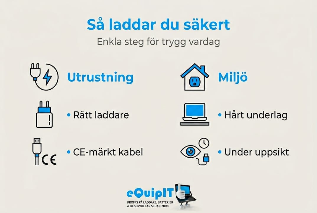 Utrustning syftar på laddaren och kabeln. Båda ska vara CE-märkta och kompatibla med enheten. Miljö handlar om var du laddar. Mjuka ytor som kuddar, sängar och soffor blockerar ventilation och ökar risken för överhettning. Beteende innebär att du inte lämnar enheten obevakad under laddning, särskilt inte under natten.