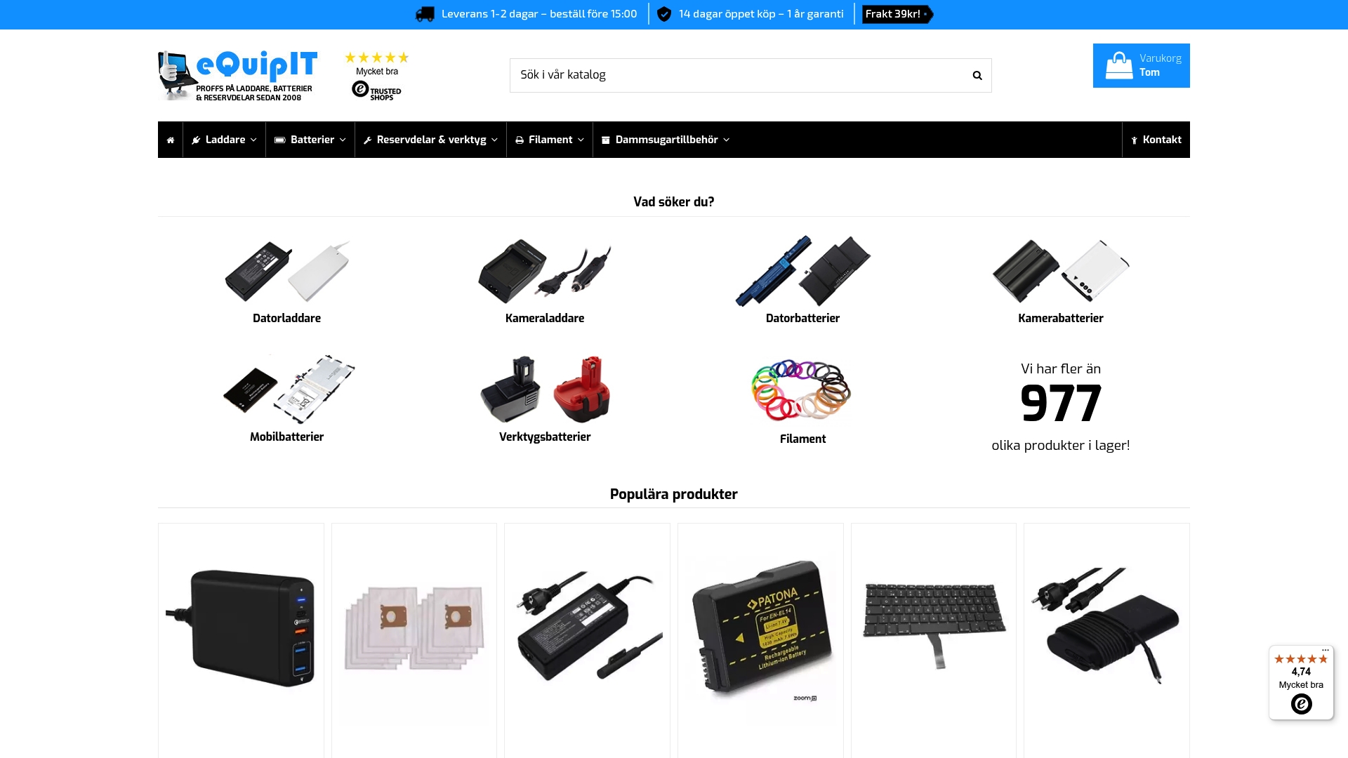 | eQuipIT.se | Laddare och reservdelar för elektronik | Brett sortiment, snabb leverans, kundvänliga villkor | Begränsad information om företagshistorik | Cirka 199 kr för USB-C-laddare |