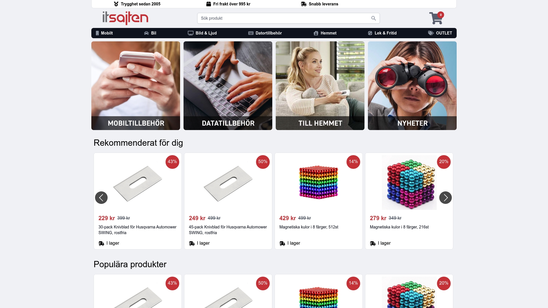 | Itsajten.se | Hemelektronik och mobiltillbehör | Låga priser, snabb leverans, användarvänlig webbplats | Enkel design, begränsad företagsinformation | Fri frakt vid köp över 995 kr |