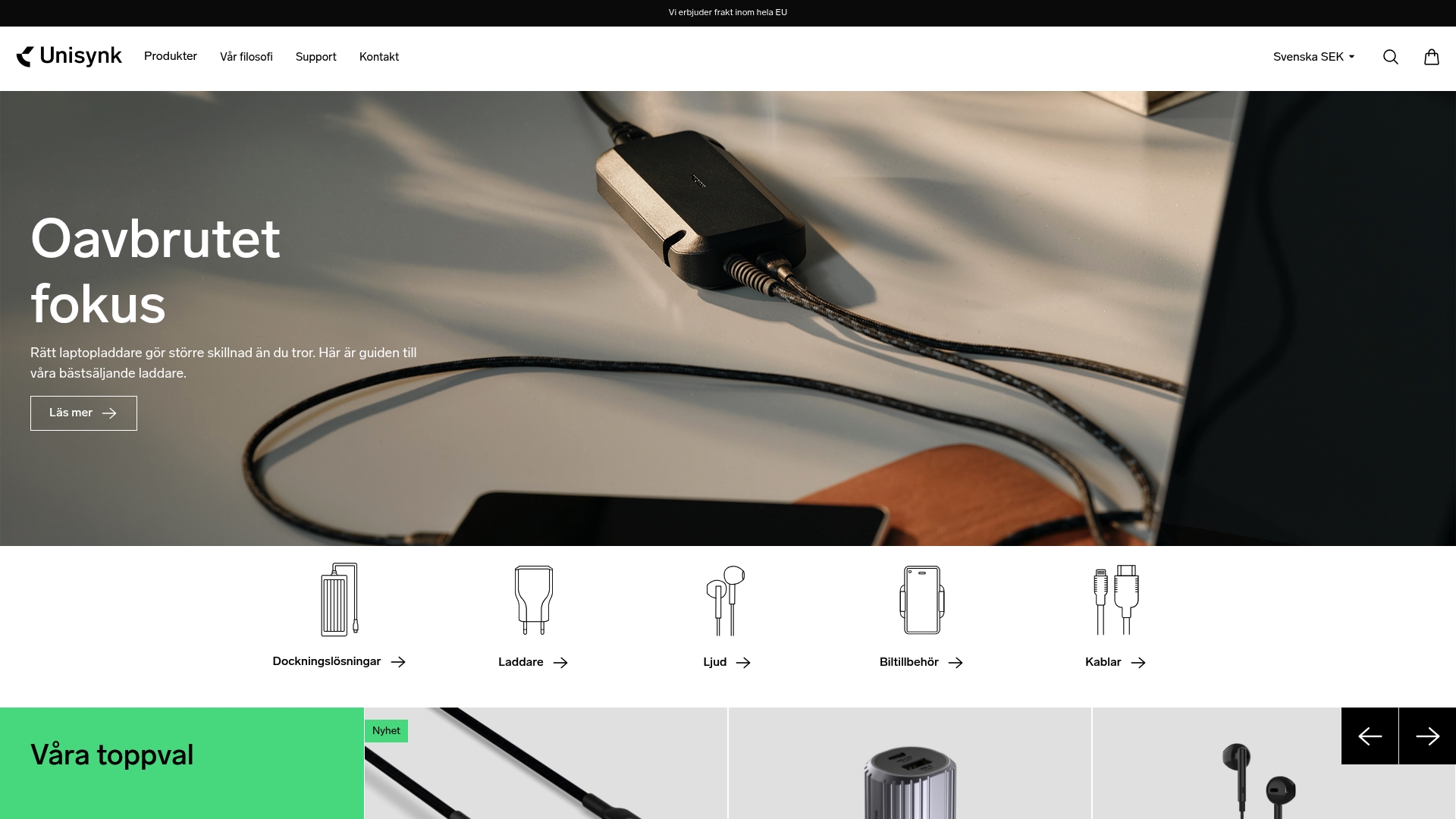 | Unisynk | Hållbara laddare och dockningslösningar | Hög kvalitet, svensk design, säker laddning | Ingen tydlig prisbredd, begränsad leveransinformation för köp utanför EU | Cirka 249 kr för magnetisk USB-C-kabel |