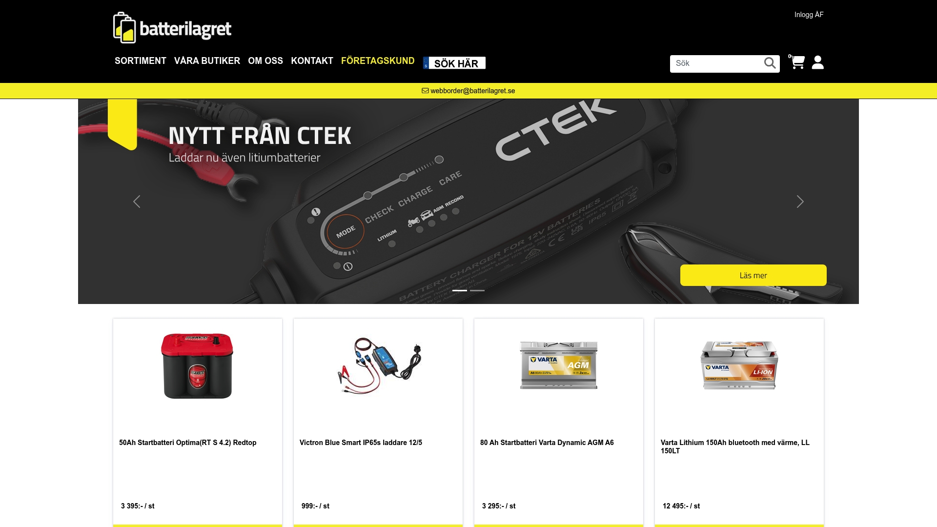 Webbplatsen innehåller information om olika batterityper och tillbehör, och företaget kommunicerar certifieringar och professionella lösningar för yrkesbruk. Fraktfri leverans gäller för vissa artiklar vid köp över ett angivet belopp.