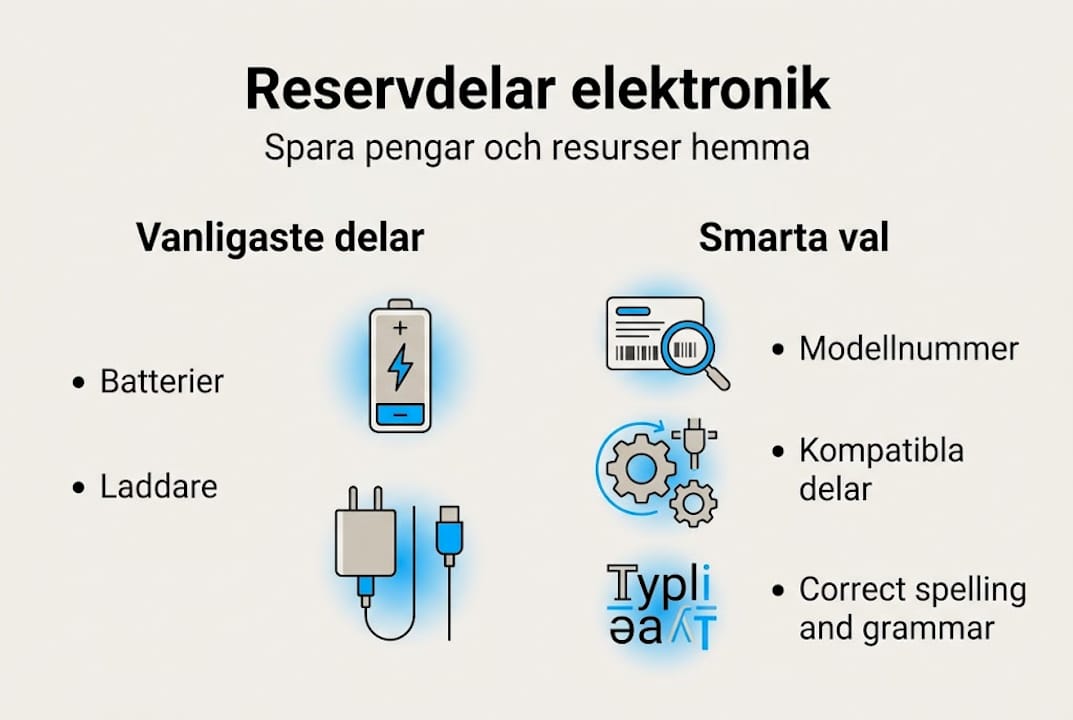 Varje år kasseras miljontals elektronikenheter i Sverige, trots att felet ofta är en trasig laddare, ett urladdat batteri eller en sprucken skärm. Att byta ut hela enheten kostar mångdubbelt mer än att köpa en enstaka reservdel. Den här guiden förklarar vad reservdelar inom elektronik faktiskt är, hur de klassificeras och hur du väljer rätt del för just din enhet. Du får konkreta exempel på vanliga reservdelar, en jämförelse mellan original och kompatibla alternativ samt en steg-för-steg-process för att hitta rätt komponent utan att göra dyra misstag.